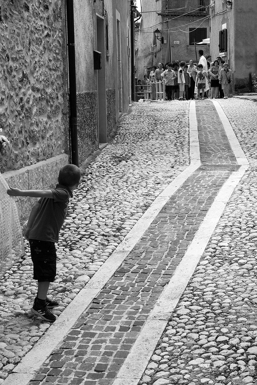 La curiosità del bambino in primo piano, la grafica del ciottolato della strada di un'antico quartiere ed il passaggio di una processione, danno un po' di dinamicità, buono il punto di ripresa è ottimo BN. Smile