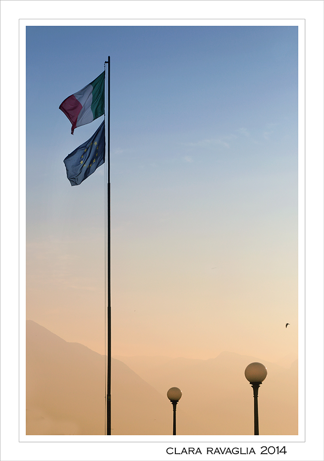 Al solito adoro le tue composizioni e questa volta abbini anche i colori: la bandiera europea blu che sventola nel cielo azzurro e i lampioni che invece si amalgamano con i caldi colori della parte bassa del frame con lo sfondo appena accennato dai monti. Riguardo il gabbiano ci sono pensieri contrastanti io mi astengo! Anzi no penso che tolga un pò di rigore all'immagine.