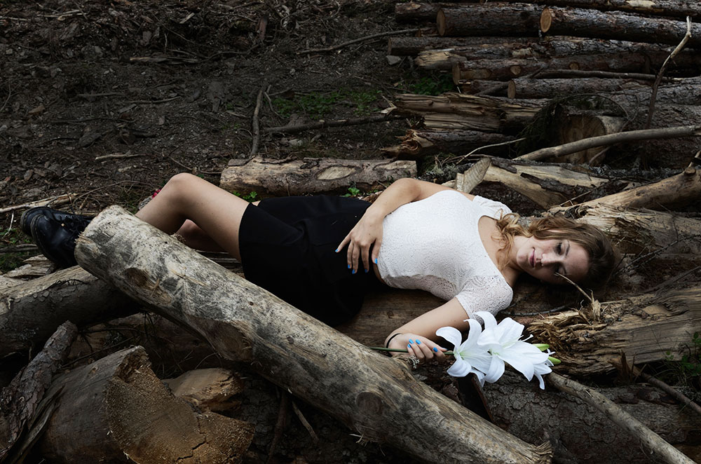 | Una domanda: che ci fa una tipa vestita da cittadina con una mini spinta e un giglio in mano scomodamente sdraiata su dei vecchi tronchi in un bosco? |