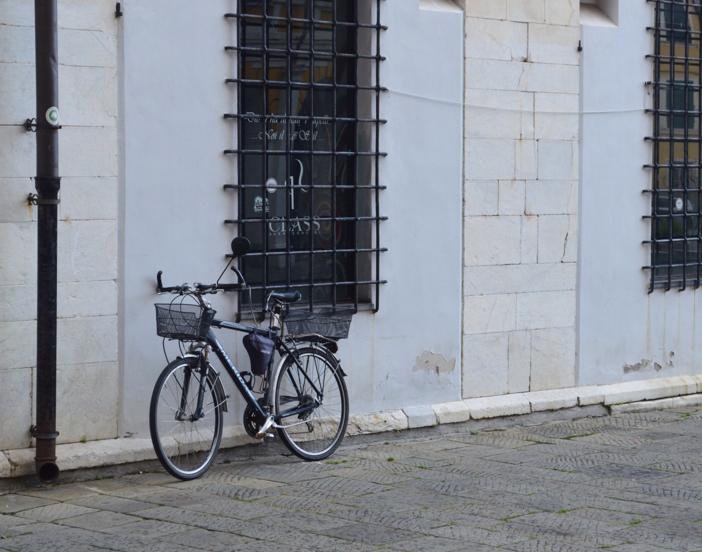 Bene i cromatismi e la tenuta in asse della macchina,la composizione mi sembra un po' sbilanciata con parecchio peso a sinistra.Tagliando il tubo si ridurrebbe lo sbilanciamento ma anche lo spazio nella direzione anteriore della bici.Se non fosse stata legata,a costo di essere scambiato per un ladro di biciclette,l'avrei poggiata nella zona tra le due grate!  |