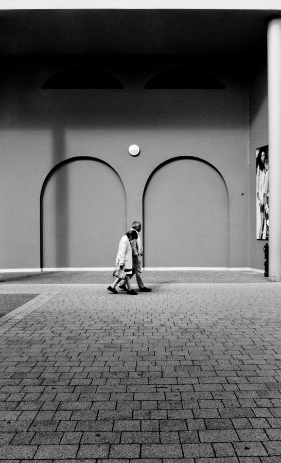 Siccome sei stato piuttosto preciso nel cogliere la coppia al centro rifilerei ulteriormente al fine di escludere l'architrave bianco e la colonna con manifesto a dx, mantenendo il formato.