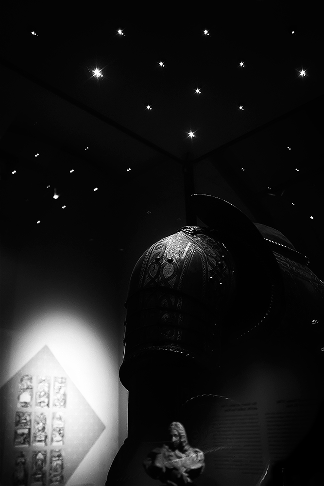 Ho lasciato l'immagine con l'inquadratura originale così come effettuata perché la presenza di maggior lucine superiormente mi accentuava l'impressione di una collocazione nello spazio dell'elemento armatura come oggetto proveniente dal passato....