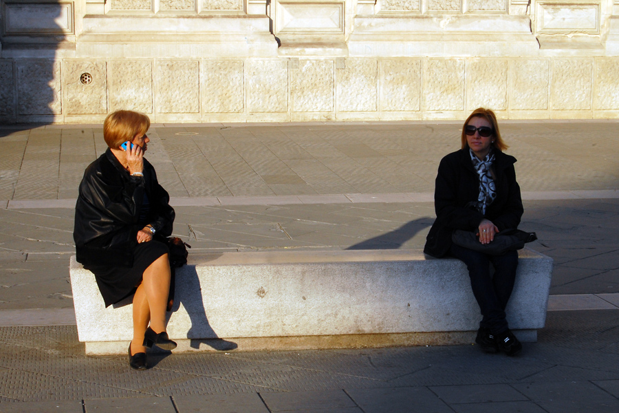In effetti l'interpretazione data da Sergio è quella che mi ha spinto allo scatto, ma il dubbio scaturiva dal momento che non sono presenti nella scena ulteriori elementi che ne enfatizzano il messaggio. Io ho percepito la distanza tra le due figure sedute agli estremi, il contrasto tra figura in luce e quella in ombra, l'attività dell'una al telefono contro l'attesa inerte della seconda in ombra.