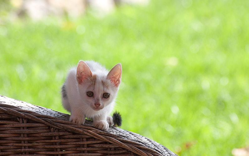 Simpatico il micetto. Ma la foto sembra soffra di una certa dominante magenta che andrebbe regolata. Mi sono permesso di allegare un esempio nel quale ho anche acceso un po' di luce sul muso e smorzato appena il vigore del verde dello sfondo.