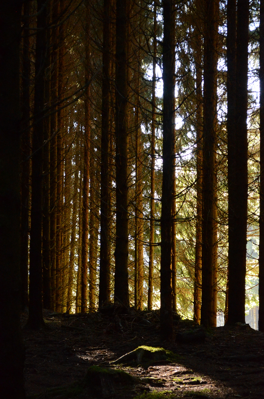 La suggestione di un frammento di percorso boschivo, di improvvise accessioni di luce intensa, quasi abbagliante per lo sguardo abituato alla oscurità del sottobosco, che filtra fra i tronchi altissimi e crea una pozza di calore nella penombra, sul cammino. La scelta compositiva stretta e verticale amplifica i senso maestoso di altezza del bosco.