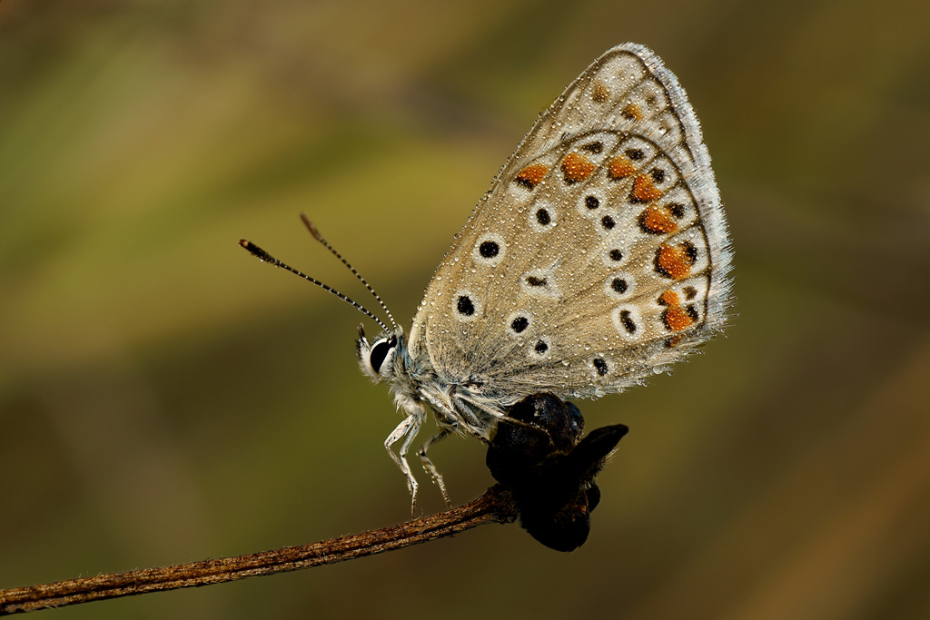 Anche io la vedrei meglio in verticale...belle le goccioline e nitida la piccola Licenide...lo sfondo non mi dispiace ne per i colori ne per la luce invece non trovo gradevole il posatoio tutto nero