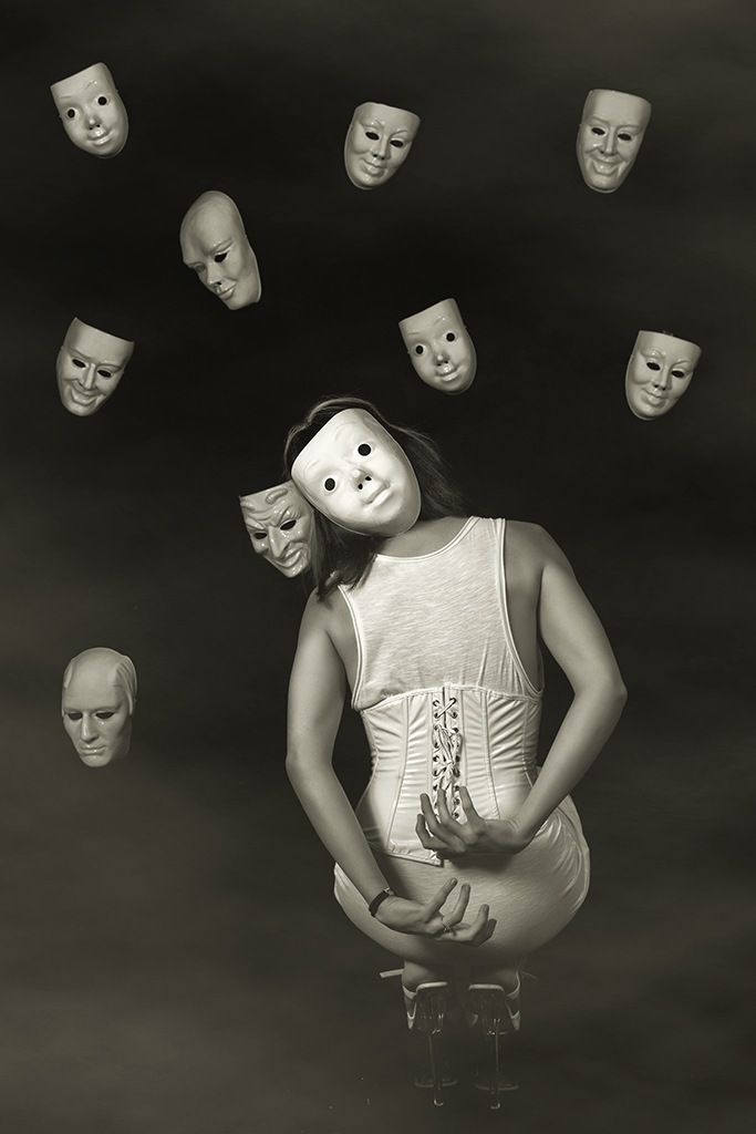 Anche io avevo pensato a eliminare testa e lasciar maschera ma poi ho pensato che volevo la donna dietro la maschera per rafforzare il concetto dei tanti finti volti.