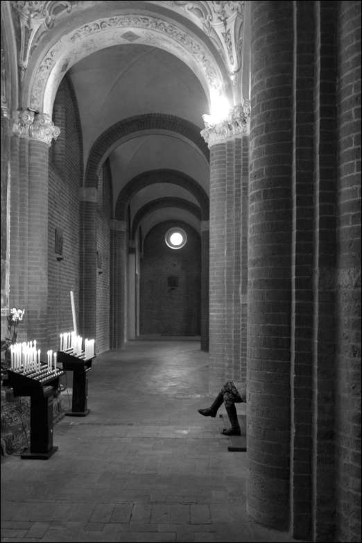 Una ragazza in minigonna e calze variopinte seduta davanti ad un altarino.... La posizione degli arti indica riflessione piu Che preghiera. Una storia interessante. Complimenti per averla saputa cogliere e per la mano ferma visto il tempo al limite