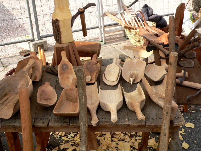 Ho cercato di far vedere il prodotto con gli attrezzi che servono a produrlo: si vedono le varie fasi della lavorazione di questi mestoli (pale)in legno.