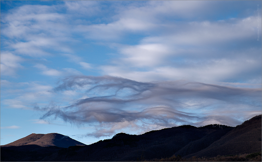 No dai... non ci credo! Queste nuvole di garza creano una catena montuosa fantasma, un altro paesaggio in agguato che solo un fotografo attento poteva fermare. Una nuova volatile geografia! E' bellissima e la metto fra el preferite per la grande originalità.