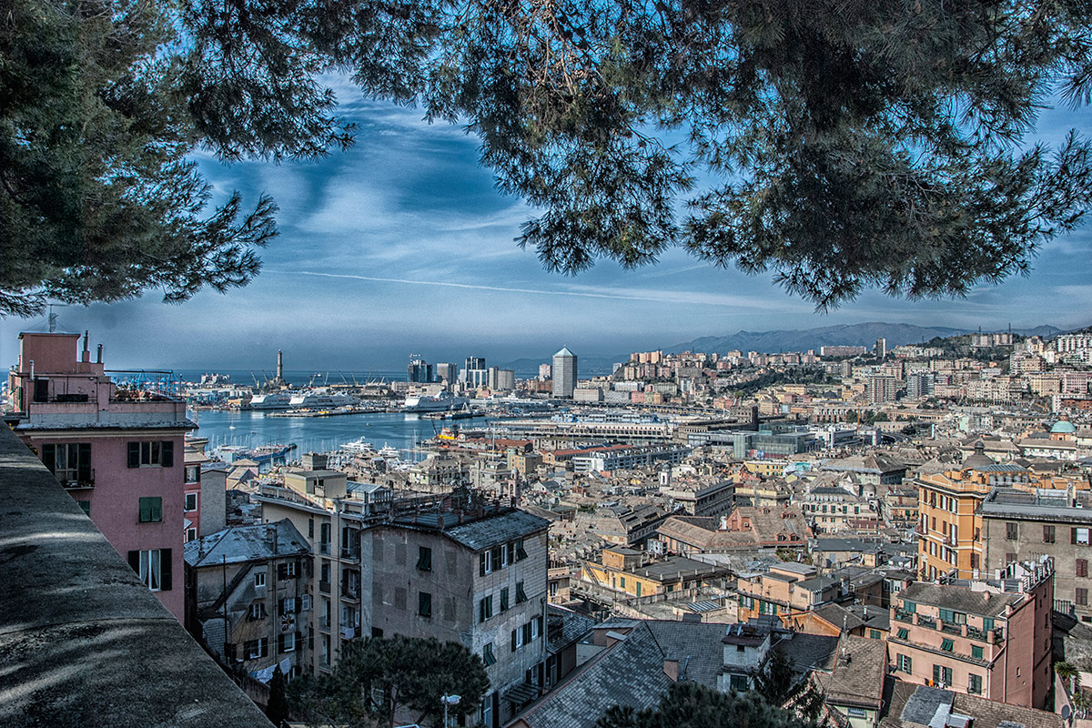 | Lanterna contro Matitone, Architettura medievale contro architettura moderna, visti da Spianata Castelletto. |