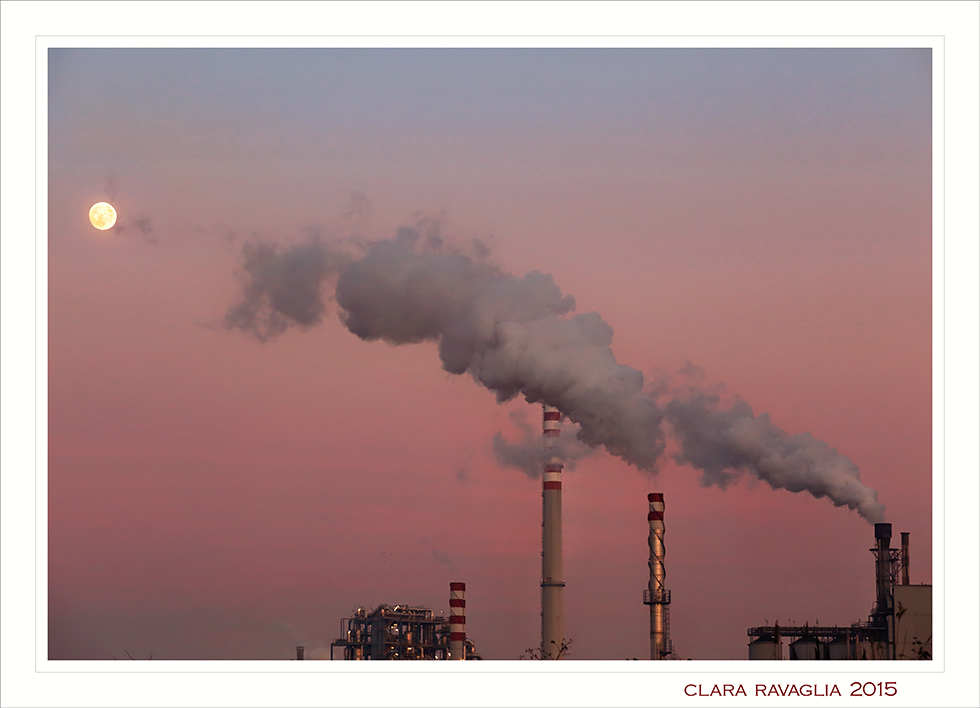 La foto è molto bella, di un romanticismo industriale. La diagonale di fumo che porta alla luna è uno spettacolo.