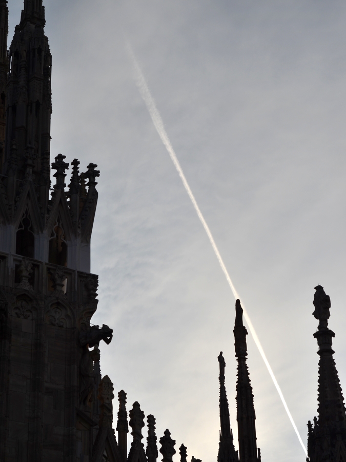 Mi è piaciuta la scia che tange la statua sulla guglia del Duomo di Milano, e che si va ad infrangere alla base dell'altra guglia.