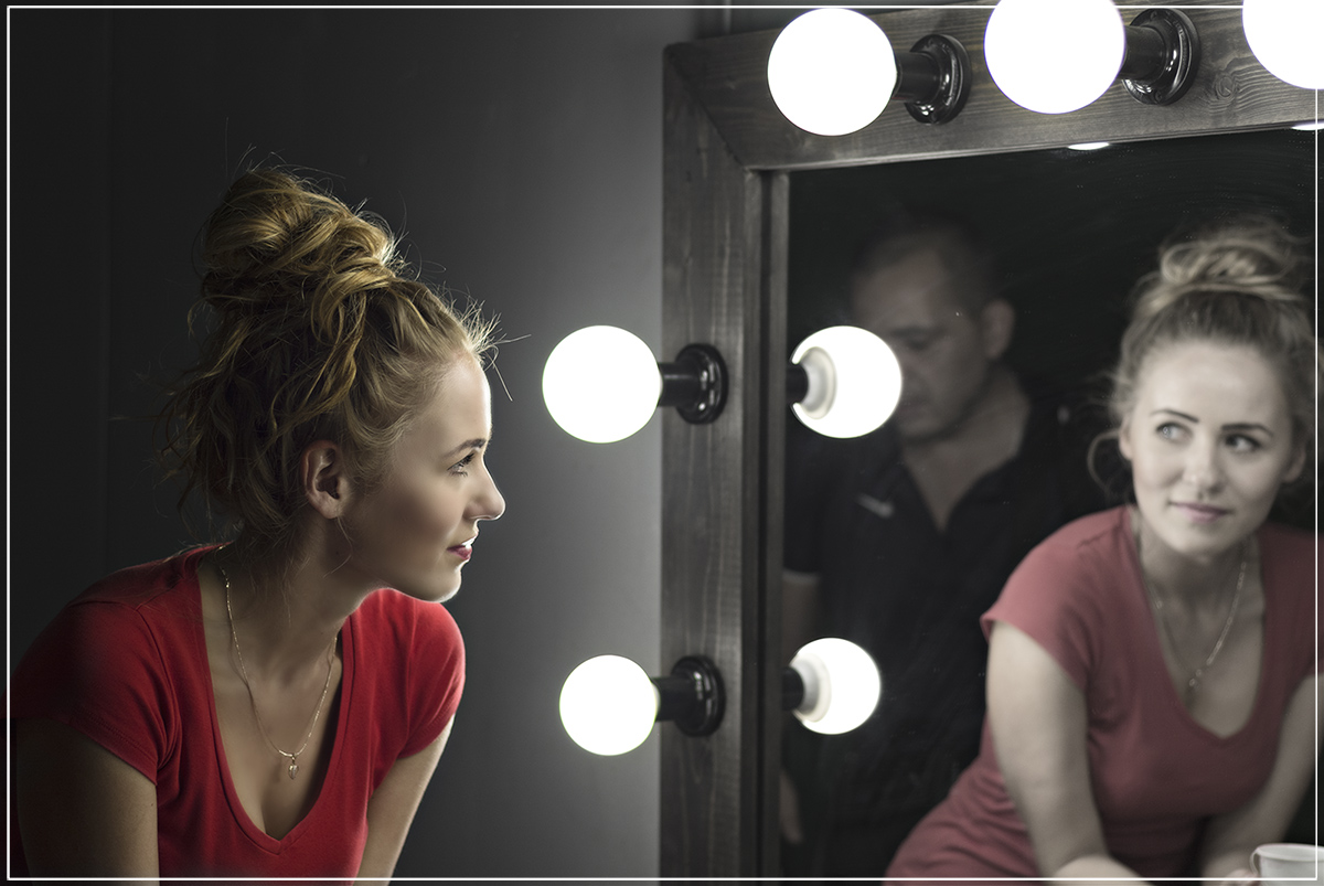 Un bel ritratto ambientato col riflesso della ragazza sullo specchio.