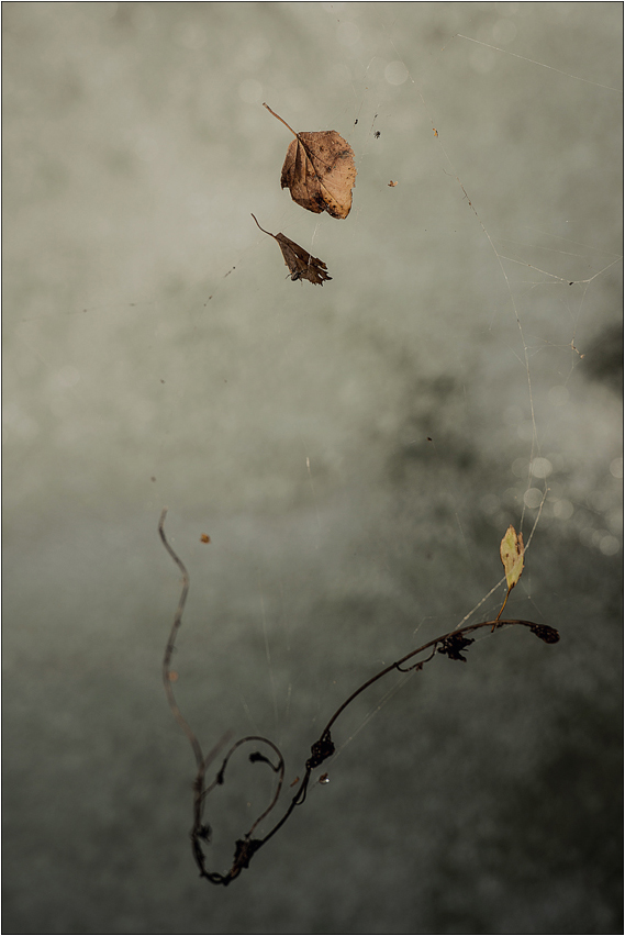 Non l'otturatore della macchina con il suo millesimo ha fermato la caduta del rametto e delle foglie ma la tela del ragno che in un pietoso abbraccio li ha accolti trattenendoli ancora un po' in una sorta di sospensione tra vita e morte prima del contatto con la fredda terra.Immagine che mi era sfuggita e fortunatamente ho ritrovato.Grande Poesia,Grande Fotografia!! Ciao,Sergio.  |