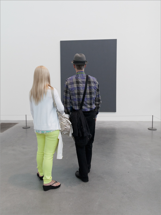 | L' inoppugnabile attenzione che i due pongono alla improbabile opera d'arte genera un effetto ludico donando alla scena una impronta .... surreale ...il nulla percepito elevato a momento emozionalculturale...importante è crederci! !!!!! |