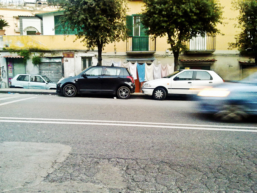 mi sarei avvicinato molto di più fino al marciapiede cambiando anche punto di ripresa includendo la panda vecchio modello che restituisce un po di stile vintage, le serrande e i panni