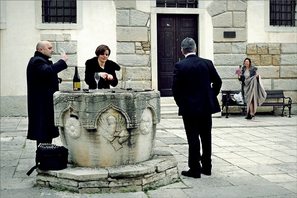 Nella piazza deserta di un paesino interno della Croazia,frequentato soprattutto in estate,un tintinnio di calici.Una coppia appena sposata brindava vicino al pozzo con i testimoni che fungevano anche da fotografi.Li ho rincontrati poco dopo in una trattoria per il pranzo di nozze.Solo loro quattro! Ho scattato camminando,senza guardare nel mirino,per non interferire nel loro suppongo desiderio di intimità.Grazie Rex_Antony,Giovanni e Mario per i graditissii commenti e le osservazioni.Ciao,Sergio.