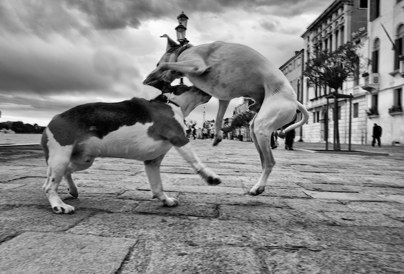 Ragionando dalla scrivania: se non avevi modo di usare tempi più rapidi l'alternativa poteva essere mettere a fuoco lo sfondo che sarebbe rimasto nitido, e provare a sfruttare il mosso e lo sfocato dei cani in primo piano anche se sarebbe servito un diaframma più chiuso per non avere solo due masse informi in primo piano.