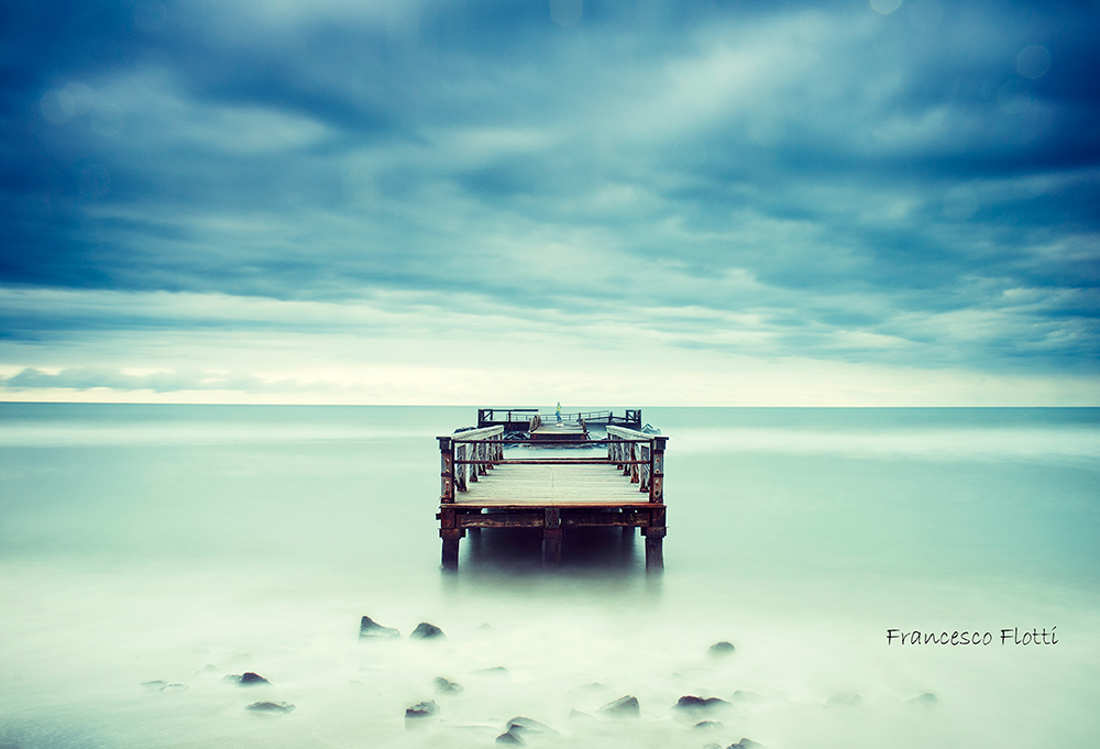 | Bella immagine colo molo solitario che sembra sbucare e reggersi sul nulla; opinabile la scelta di far coincidere la linea dell'orizzonte con il margine superiore dello stesso. Personalmente avrei dato meno ciano. |