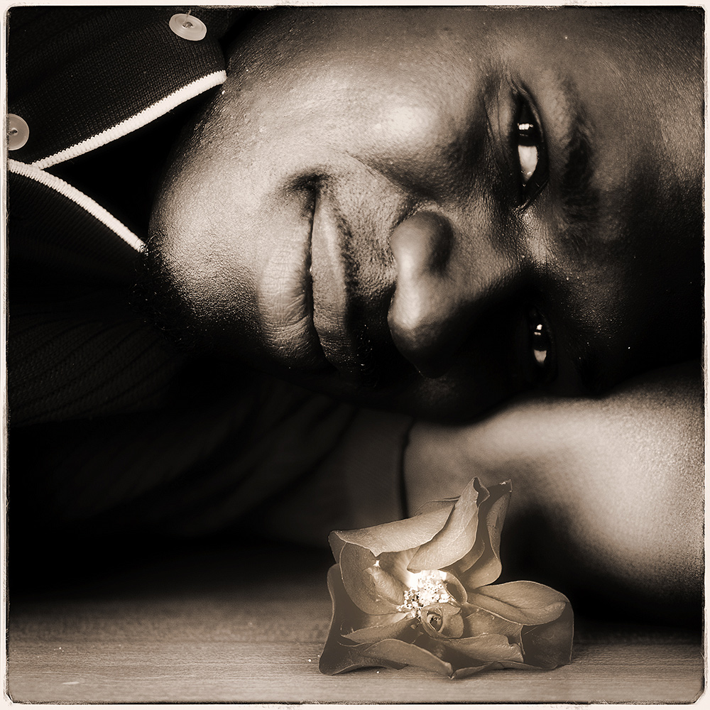 Quasi un effetto dragan sul volto, che rende inciso e contrastato ogni dettaglio. Eppure questo viso, il suo appoggio al piano ed il bel sorriso , restituiscono una grande dolcezza e confidenza. La presenza del fiore in pp è gentile, ma.. si tratta di gusti, quasi superflua. Siamo in sezione ritratto e il fiore è una presenza che per me ( non è detto poi che sia così) tradisce una certa costruzione, una logica da set prima dello scatto, che mi sottrae un po' della magia che il solo volto avrebbe dato.