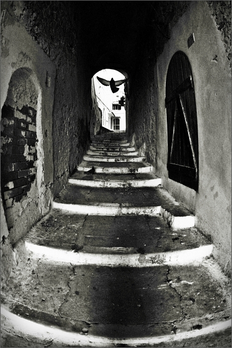 Ben inquadrato nell'arco di luce il piccione nel ruolo dello spirito santo. Giusto l'impianto centrale ma un filo d'aria in più a sinistra ci stava bene (lo dico nella consapevolezza di quanto lo scatto sia colto... "al volo" e con un angolo di campo decisamente ampio). Pesa un po' in basso la (tua) ombra sui gradini. Nel complesso però il volatile "regge" la foto che funziona.