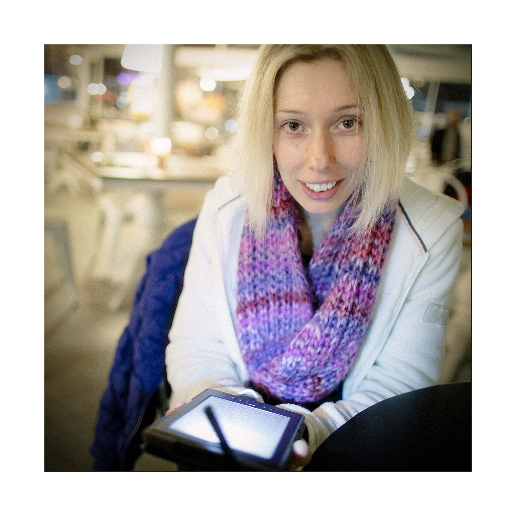 Bello il cross processing, i colori sono modernamente freddi e brillanti. Esaltano la sua carnagione chiara e si accompagnano perfettamente al colore dei capelli. Bello lo sfocato, e naturale, serena ed anche un pizzico giocosa la espressione di lei. L'azzurrino dello schermo del kindle paperwhite aggiunge la sua utilissima luminescenza alla scena.