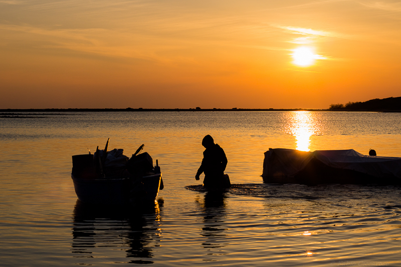 Un bel tramonto dorato, una buona composizione a formare una diagonale con la barca ed il soggetto umano a completare ed impreziosire l'immagine