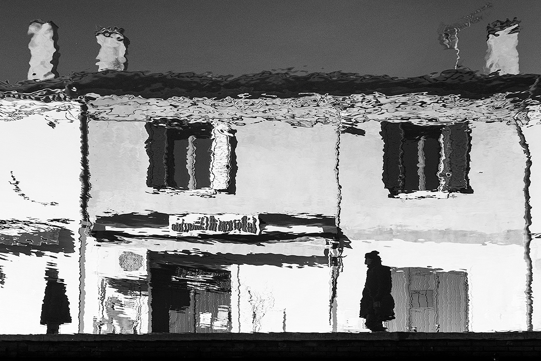 Molto bella. Non so però quanto sia street questa tua efficace proposta. ( aspetteremo gli esperti di sezione per dire l'ultima parola). Questo perchè i due protagonisiti sono così armonicamente inseriti nel cotesto, da far involontariamente pensare ad un minimo di regia a scapito della casualità. La persona a destra ha visibilmente un accenno di passo, o va bene, mentre la figura a sn, così immobile, quaso in attesa, magari con una sigaretta accesa, sembra quasi un presenza posata. Anche se invece tutto è fortuitamente casuale magari. Certamente un ottimo bianco e nero, contrastato, che esalta il tremulo riflesso... Io la avrei titolata: