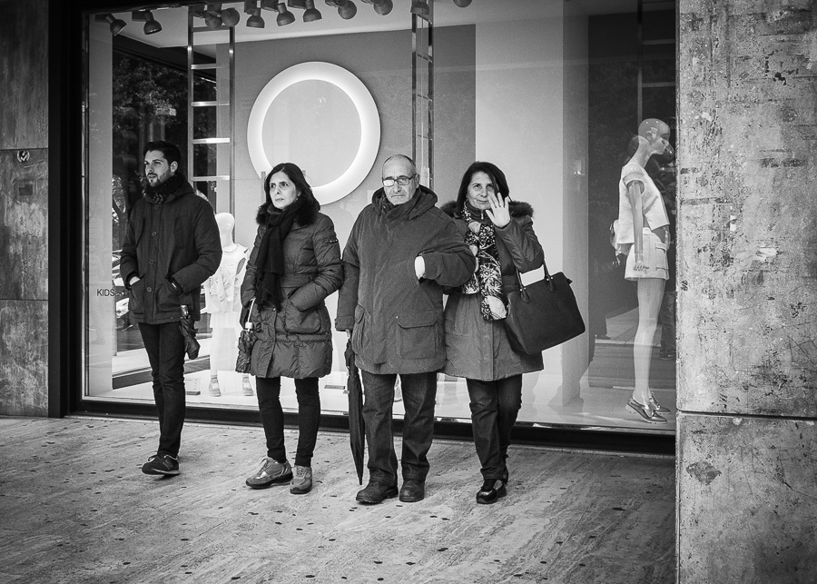 Mi fa pensare ad un ritratto di famiglia in esterno.Credo siano tutti consapevoli dello scatto,la signora accenna un gesto forse di gentile diniego ma potrebbe essere anche un cenno di saluto,il viso è atteggiato a sorriso.L'uomo guarda diretto in macchina con una espressione indecifrabile tra il contrariato,l'indagatore o il compiaciuto.La coppia più giovane cerca di ignorarti volgendo lo sguardo altrove.La presenza del manichino aggiunge un che di surreale.Bello il bn.Mi piace!  |