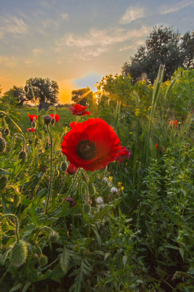 Forse barando con la post potresti far sparire, uniformando la linea orizzonte con le tonalità del giallo che lo circondano. Potresti poi abbassare la saturazione generale che è troppo intensa e magari eliminare una parte di verde alla base, che in fondo è troppo ampia e spettinata. Ne uscirebbe un formato quadrato con il papavero centrale, più gentile nei toni e senza accensioni smodate di luce.