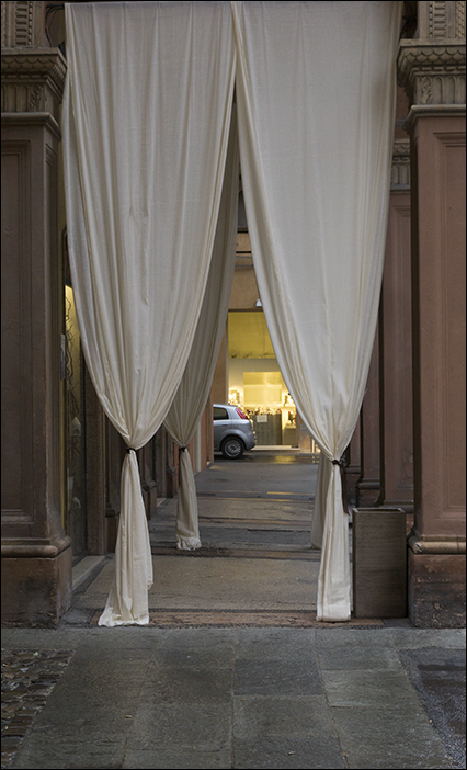 Questo lato B automobilistico, un po' banale, di anonima vernice argento, sembra quasi un aliena intrusione, in un affondo visivo oltre il portale elegante disegnato da questi due drappi , come una quinta di palcoscenico, che centra la luce calda della vetrina. Particolare e interessante.