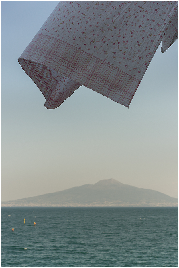 Una fascia con il mare increspato, la sagoma del vesuvio, il vento che muove il tessuto sul cielo... Semplice ed evocativa.