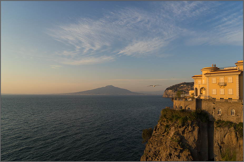 Personalmente mi trovo d'accordo con te: qui la forza anche tonale della parte destra con le tue tinte sature e calde, richiede per me infatti un respiro ampio a sinistra per controbilanciare, e poi così il Vesuvio lontano si trova perfettamente al centro dell'orizzonte. Fortunello poi con quel volo largo che si trova nella direzione del tuo obiettivo. Molto bella.