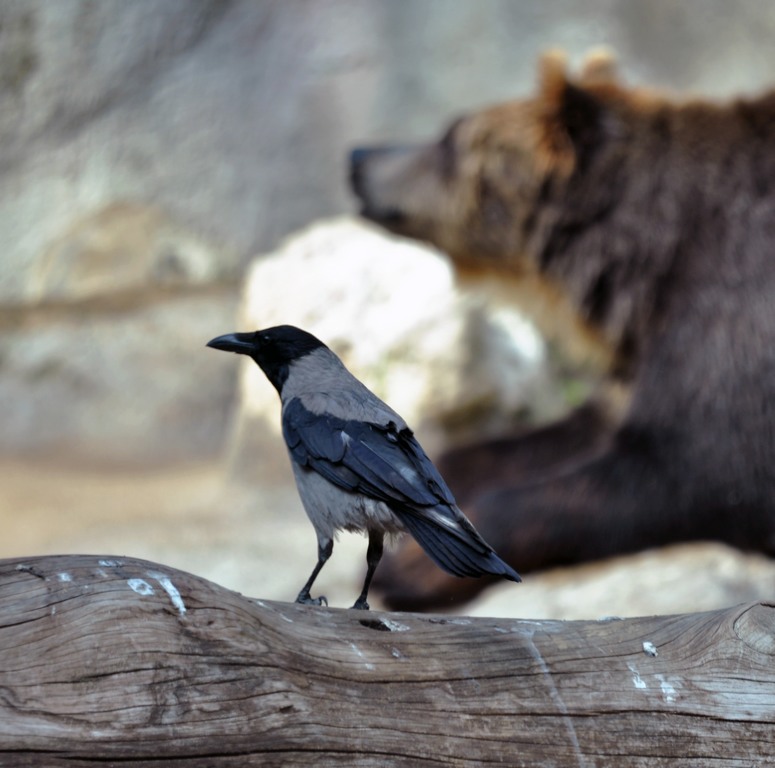 Bella la contrapposizione tra il piccolo corvo in primo piano e il grande orso sullo sfondo.
