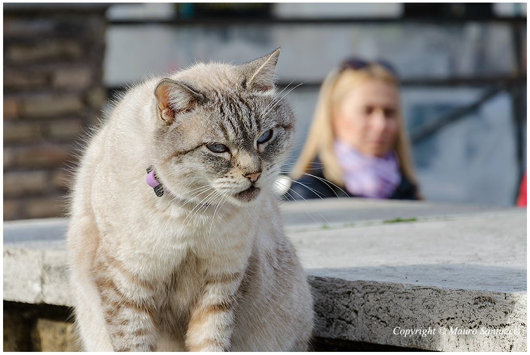 collare del gatto che richiama il foulard della signora sullo sfondo, per di più con una buona composizione