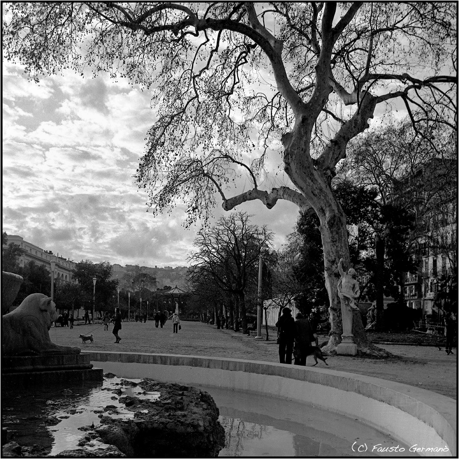 che bello quell'albero che giganteggia per tutto il frame, la fontana cosi' disposta fa da ostacolo e mi induce quasi a scavalcarla per raggiungere coloro che passeggiano...molto teatrale...