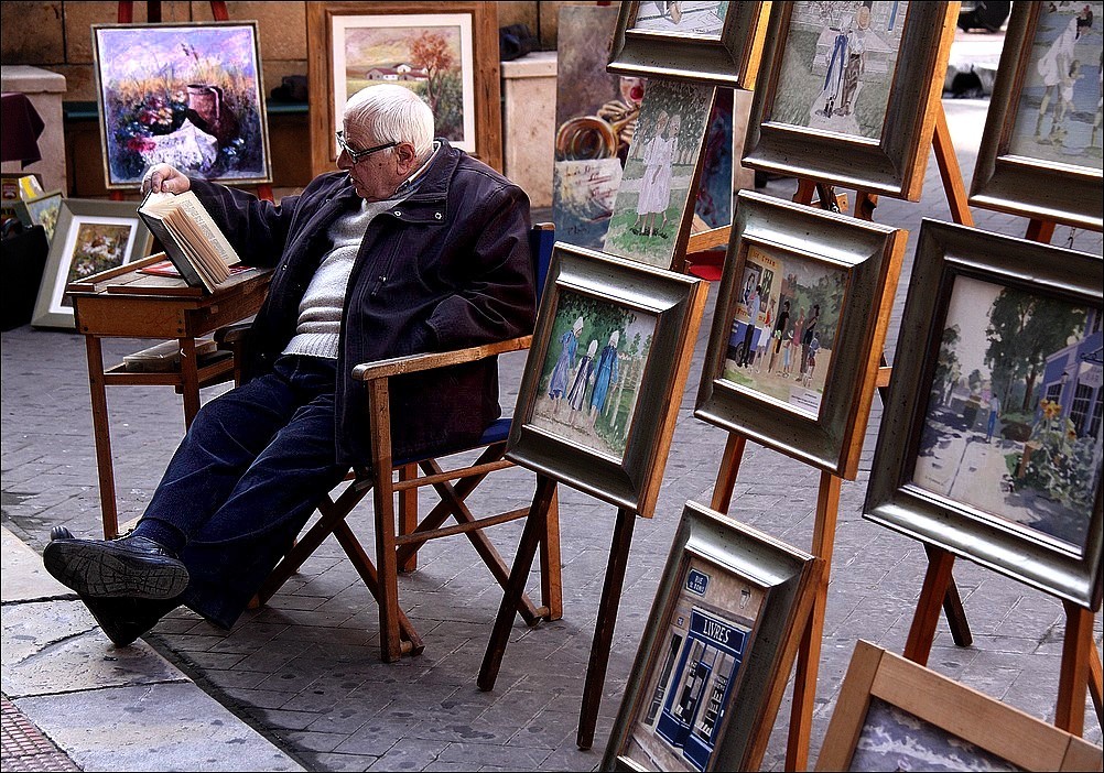 Ho detto che l'accostamento fra pittore e lettore e solo casuale, anzi preciso non avevo quasi preso in considerazione questo aspetto, non è stato certamente ciò che mi ha indotto a scattare: semplicemente mi è piaciuto il pittore (perché di pittore si tratta, lì da anni) circondato dai suoi quadri, che inganna con la lettura di un libro l'attesa di un possibile acquirente. Insomma lo avrei fotografato anche...in mancanza del libro.