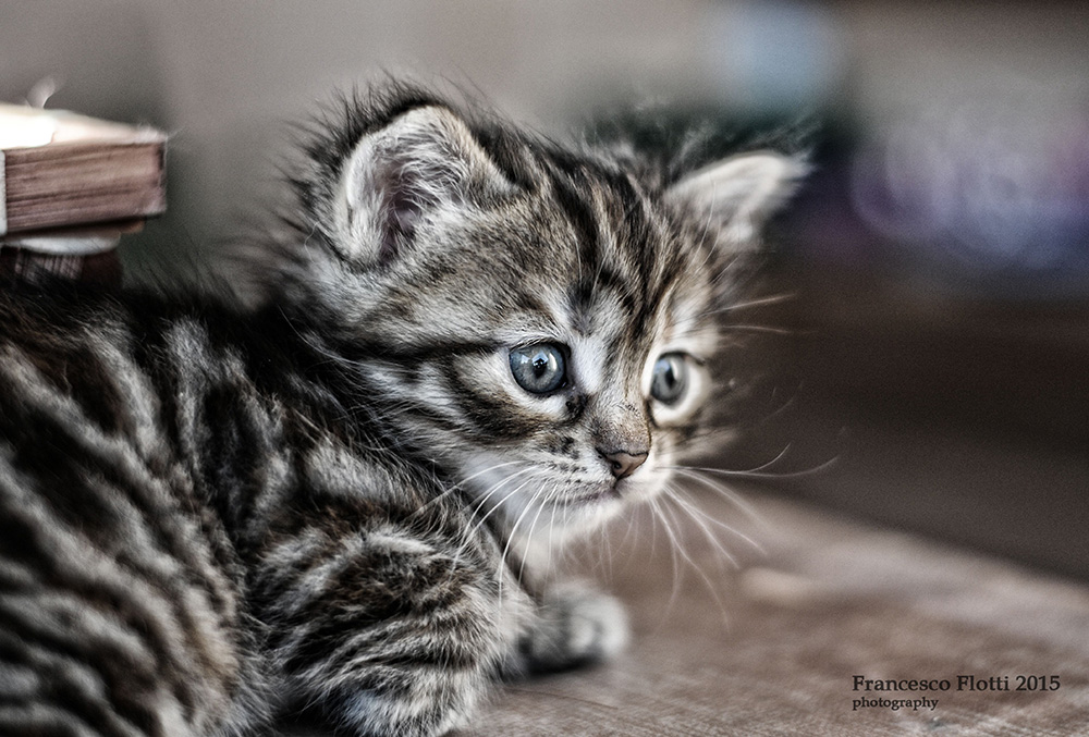 | È una delizia questo micetto.   Avrei preferito che non vi fosse quell'intrusione, un libro, a sx per avere una immagine che ancor meglio uscisse dal bel sfocato dello sfondo.