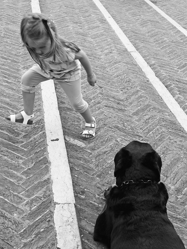 @ Mario, la bimba "sfidava" il cane correndogli davanti, ma poi teneva gli occhi bassi, forse per paura.