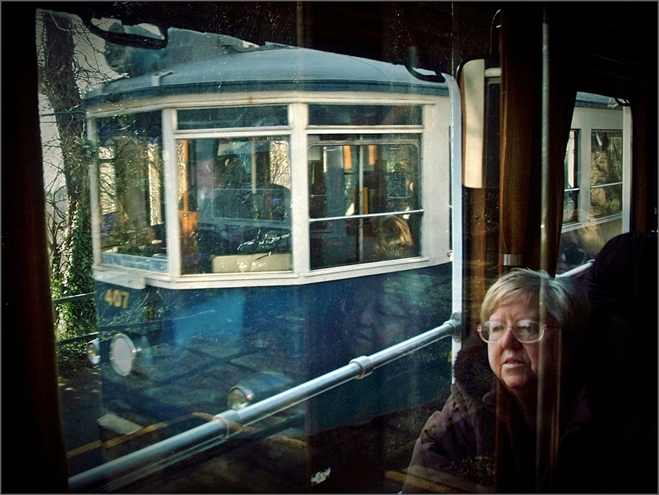 Mi piace. "la linea" che porta al volto della donna, la sua espressione, il tram azzurro fuori dal finestrino, il gioco dei riflessi... Bella.