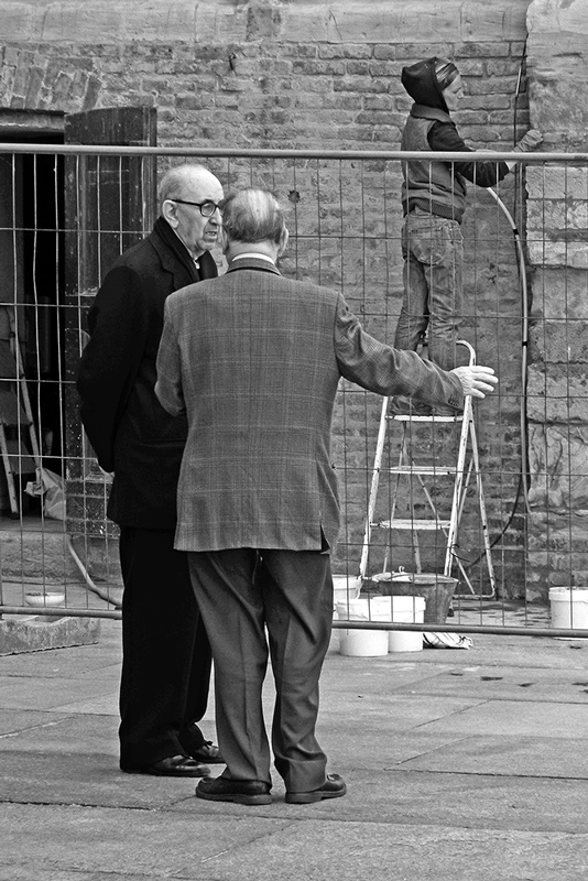 Non mi convince molto la conversione in b/n sulla fronte dell'uomo con gli occhiali, mano dell'uomo che regge la scala e sull'incarnato della donna che risulta un po'grigio.
