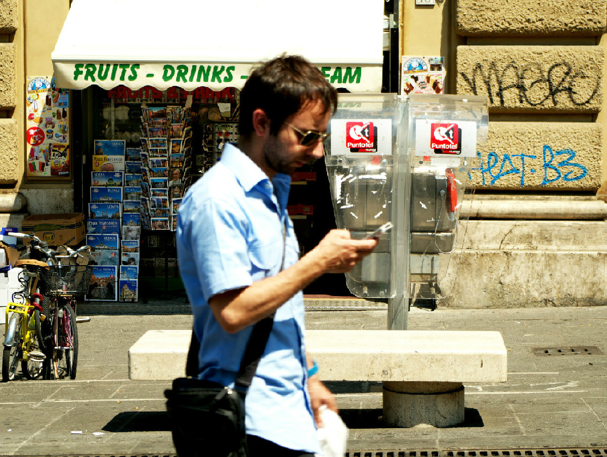 Ciao non vedo un vero e proprio punto di interesse o un'azione degna di ripresa, forse l'assonanza tra il tipo che usa il cell. e i telefoni pubblici vuoti subito dietro?