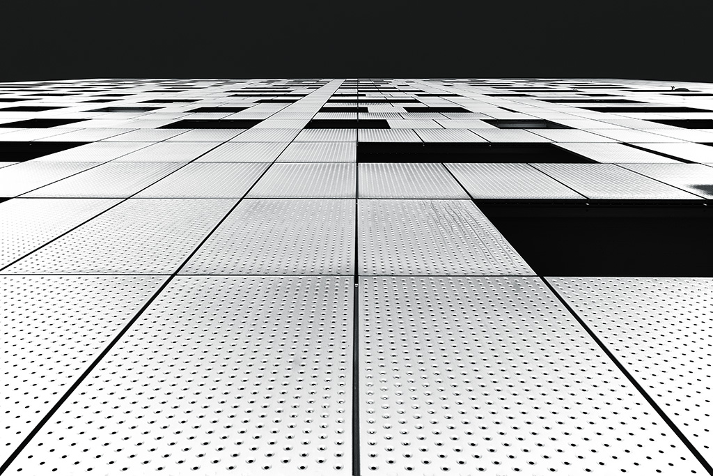 Beh, in questo caso Gennaro ha saputo sfruttare al meglio questa incredibile facciata metallica per rendere al meglio il materiale di cui è fatta e addirittura enfatizzare così tanto quel nero che sembra assoluto e tante voragini sulla facciata, che ripresa così dal basso diventa quasi un pavimento che corre verso l'orizzonte.