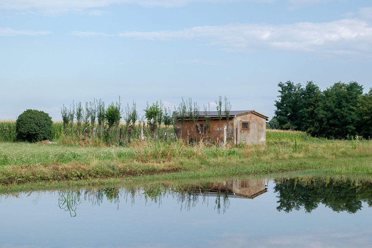 Giò, il cespuglio è più lontano rispetto alla casetta ecco perchè non riesce a lasciare il riflesso nell'acqua. La casetta stessa più vicina se ne vede solo una porzione superiore