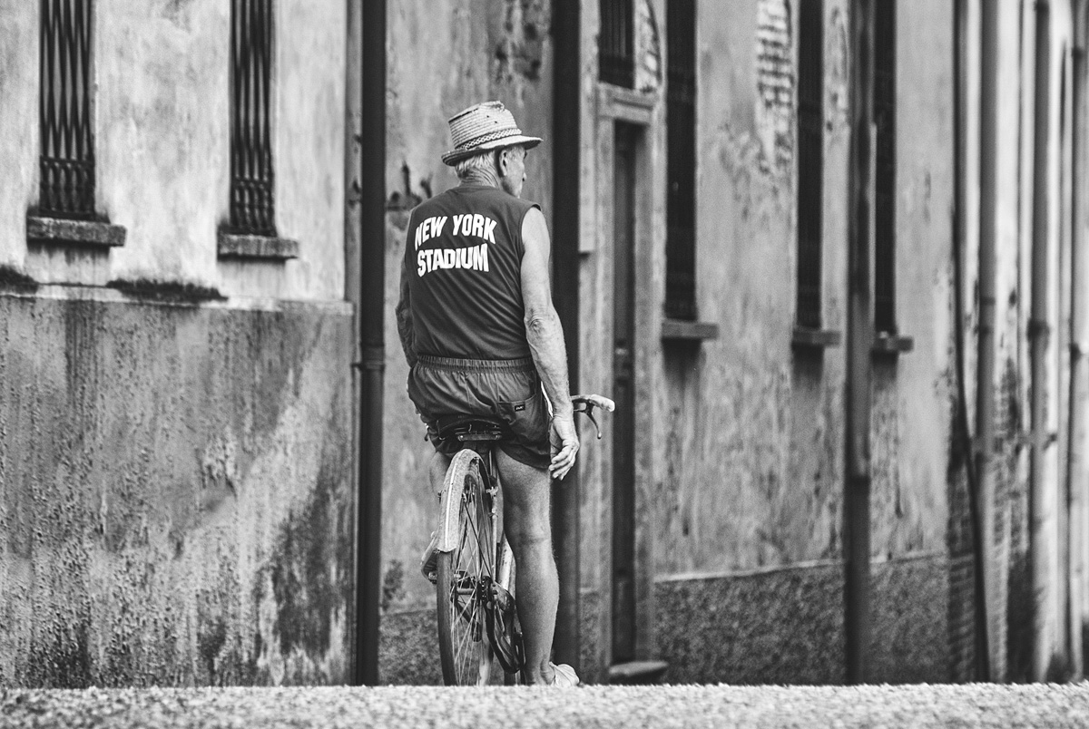 Interessante come immagine, l'anziano con cappello di paglia. la bici e la canotta "New York Stadium" sono un ottima contrapposizione a mio avviso.