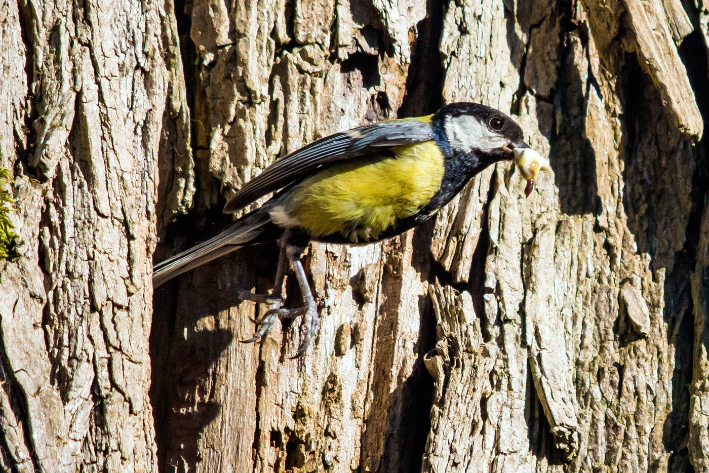 Ecco ben ripresa una cinciallegra mentre asporta dal nido il sacco fecale di un piccolo.