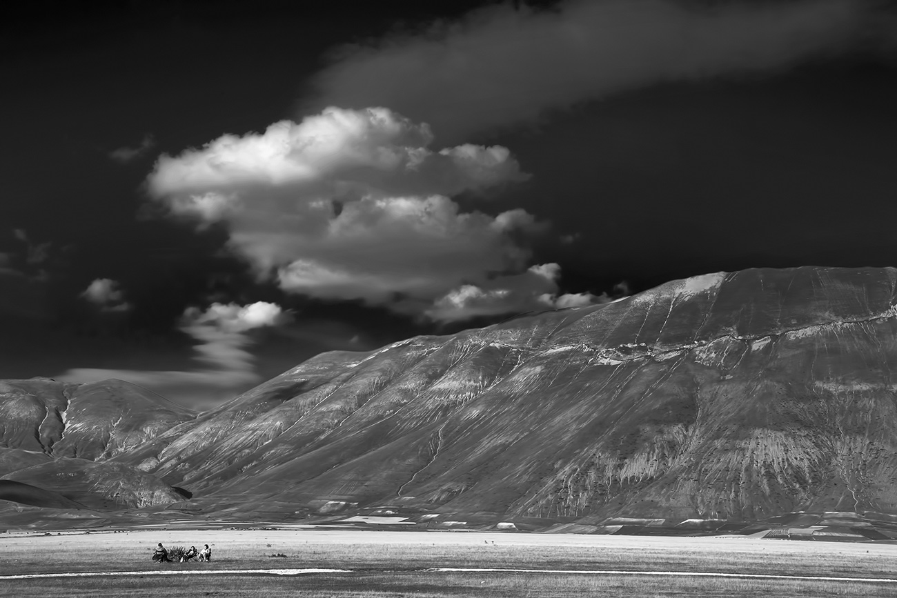 | Clara Ravaglia ha scritto: | Un paesaggio fortemente interpretato e dalla post precisa , che esalta la maestosità del paesaggio e la imponenza delle pareti d'intorno, sovrastate da nuvole importanti. Il cielo quasi nero contrasta con le piccole presenza umane nella piana, che spiccano su tutto serenamente, minuscole ma dettagliate ed importanti, in una speciale convivenza entro la situazione paesaggistica.
