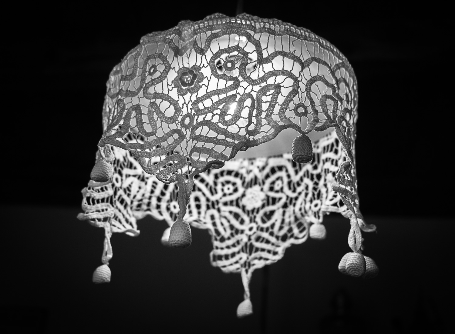 Avrei possibilmente reso completamente nero lo sfondo, in modo da non distinguere neppure l'ombra delle cose intorno, e allora il luminoso paralume ricamato starebbe sospeso nel buio come un medusa che fluttua in un oceano notturno. Puoi farlo facilmente duplicando il livello ed usando un maschera per agire selettivamente sullo sfondo.