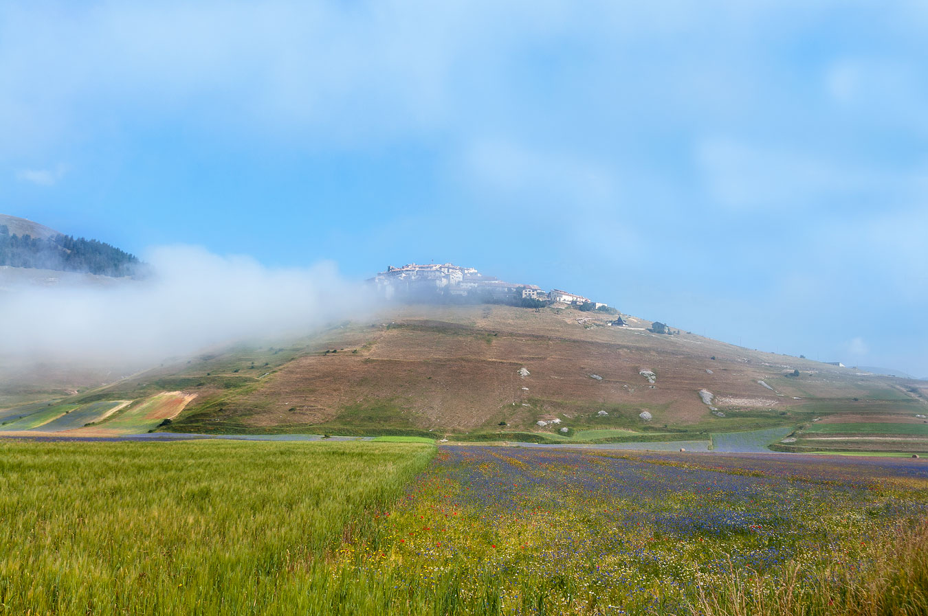 Molto bella Emanuela. Semplice e pulita, con un cielo alto che qui apprezzo, perchè è leggerissimamente screziato di sfumature chiare, di velature di nubi. Sul paesello un fiocco di nuvole, come il fumo di un camino che libera la sua cometa di bianco... Castelluccio e la sua location si prestano come vediamo dalle tante situazioni ed interpretazioni fotografiche , a visioni maestose , come ad altre più serenamente bucoliche. Carinissime anche le tinte, i colori vivacemente pastellati, ma morbidi, con azzurrini e verdi un po' bebè.